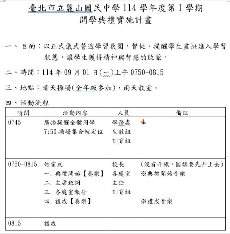 | 校長 各處室主任 訓育組 | (沒有升旗,國旗要先升上去) ※典禮開始音樂