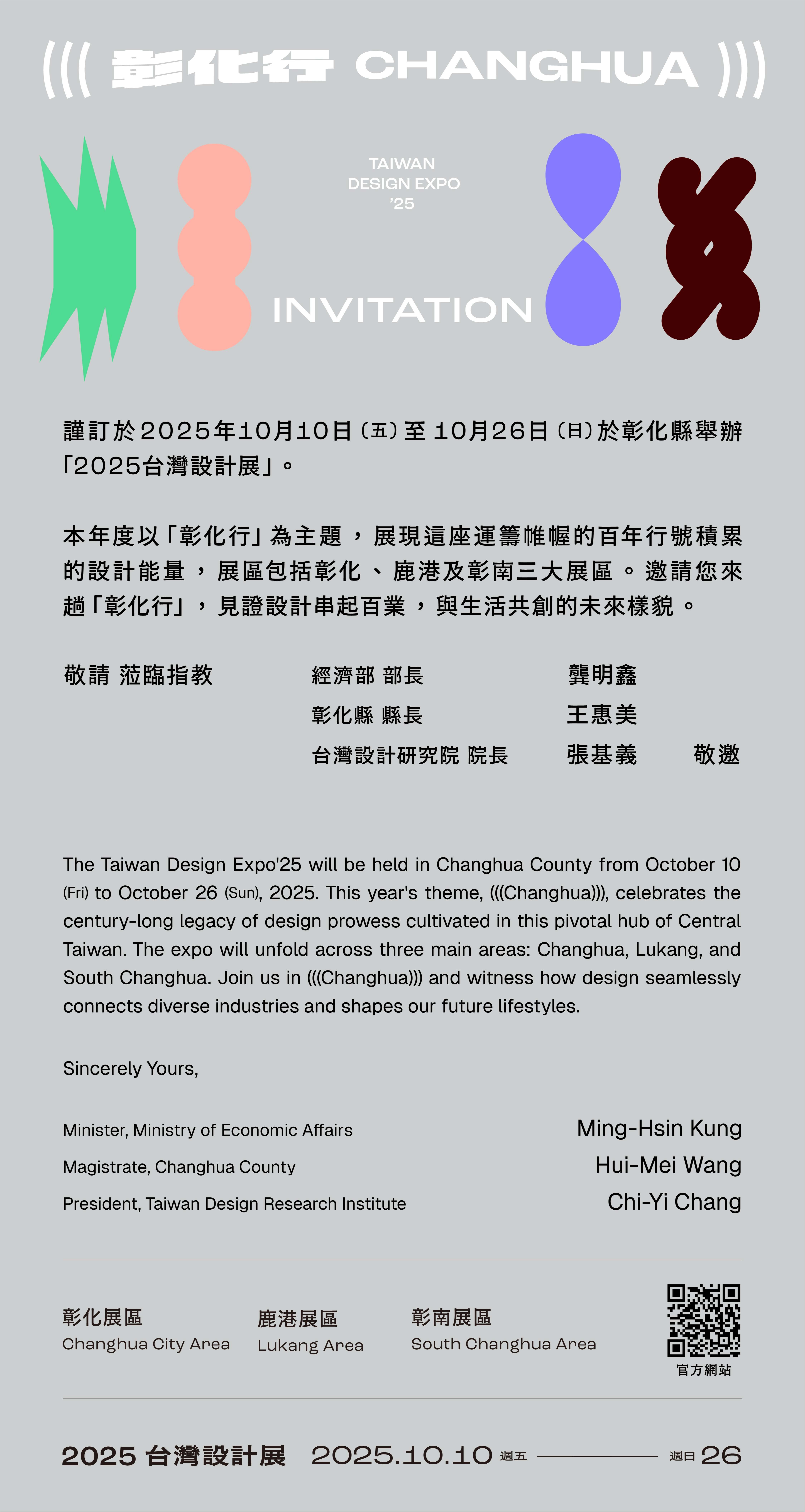 二、2025台灣設計展主題為「彰化行 (((CHANGHUA)))」,由設計師聶永真操刀,匯聚700位設計師、1,640家廠商及600家在地店家參與,展覽橫跨彰化、鹿港、田中、田尾等地,規劃三大展區與15個主題展,完整呈現彰化的產業、文化與創意。展區參觀時間為每日上午10點至下午6時,週五週六延長至晚間8點。