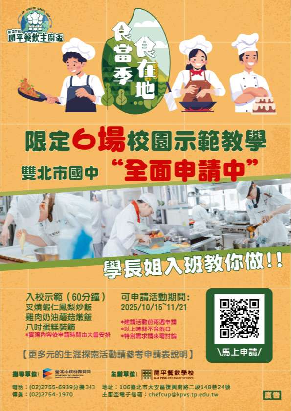 一、為推廣餐飲教育與實作體驗,開平餐飲學校辦理「第27屆主廚盃」系列活動,規劃限定6場校園示範教學,邀請雙北市國中學生一同進入廚藝實作的現場,透過專業師生的親