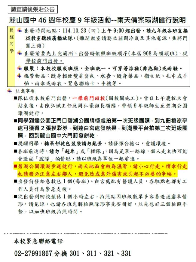 另外,原定九年級親山步道健行活動,適逢近日多雨潮濕,碧湖公園登山步道濕滑,