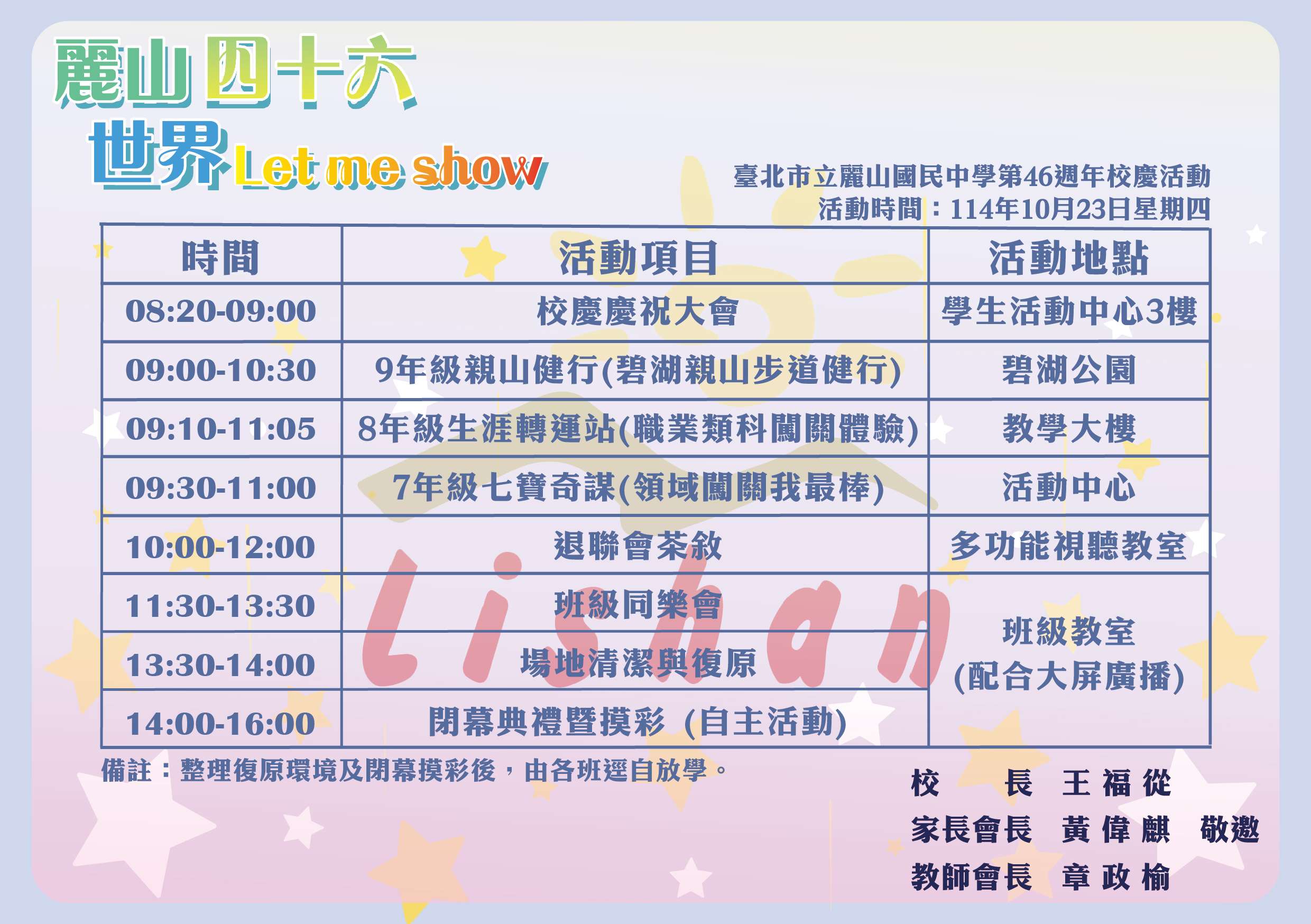 本校訂於114年10月23日(四)舉辦第46周年校慶活動,活動流程請參閱邀請卡。