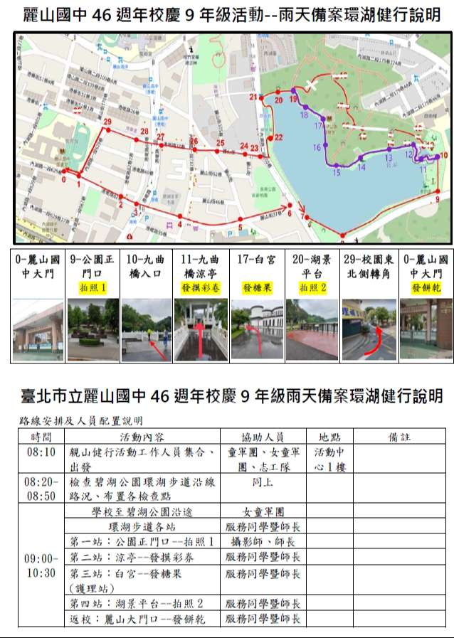 考量活動師生安全,調整為碧湖公園環湖健行活動(僅環湖,不登山;另當天有攝影師拍攝班級團照,請參閱說明),