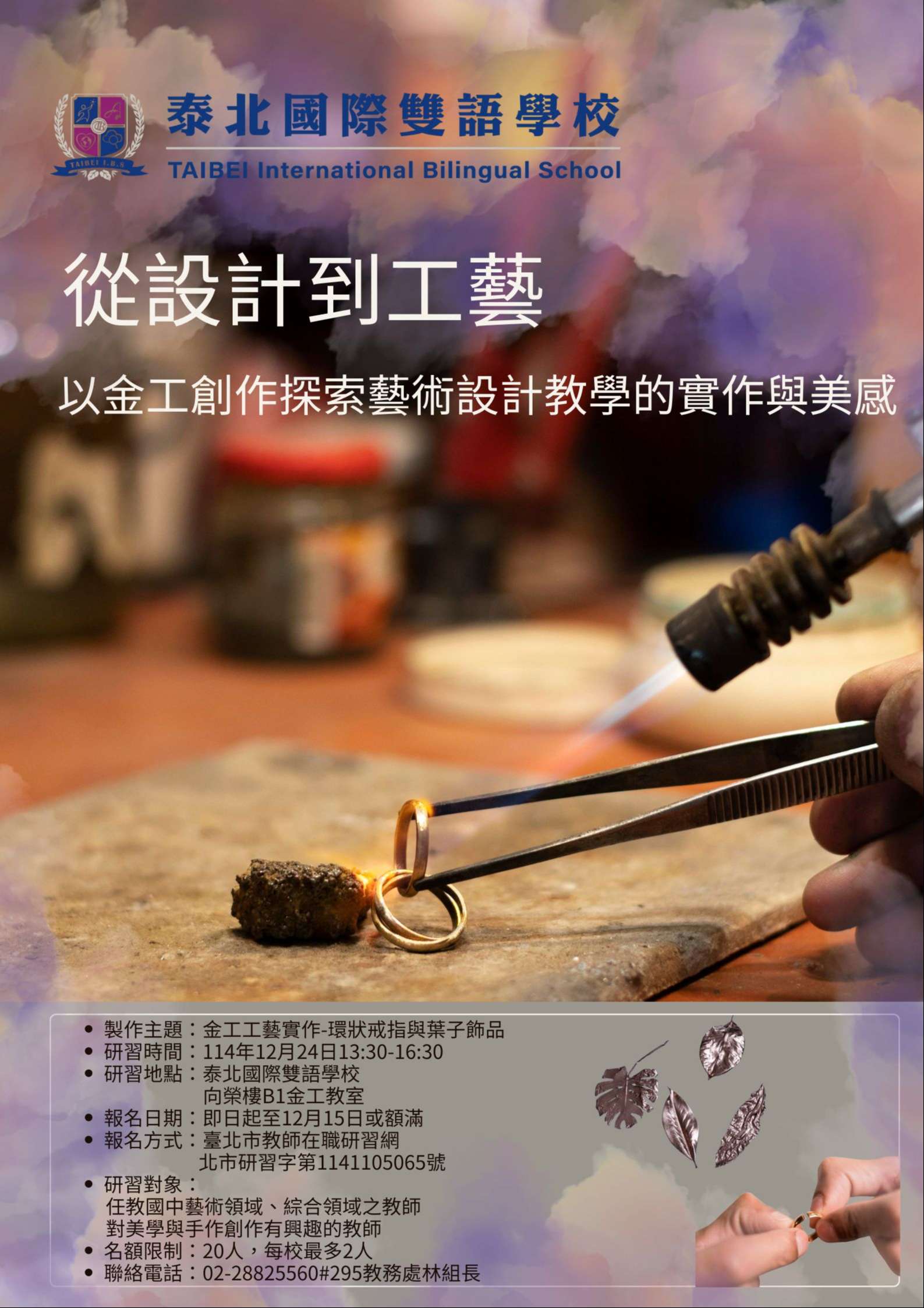 轉知-臺北市私立泰北高級中學六年一貫專業科目實作工作坊-「從設計到工藝:以金工創作探索藝術設計教學的實作與美感」教師研習,詳如附件。