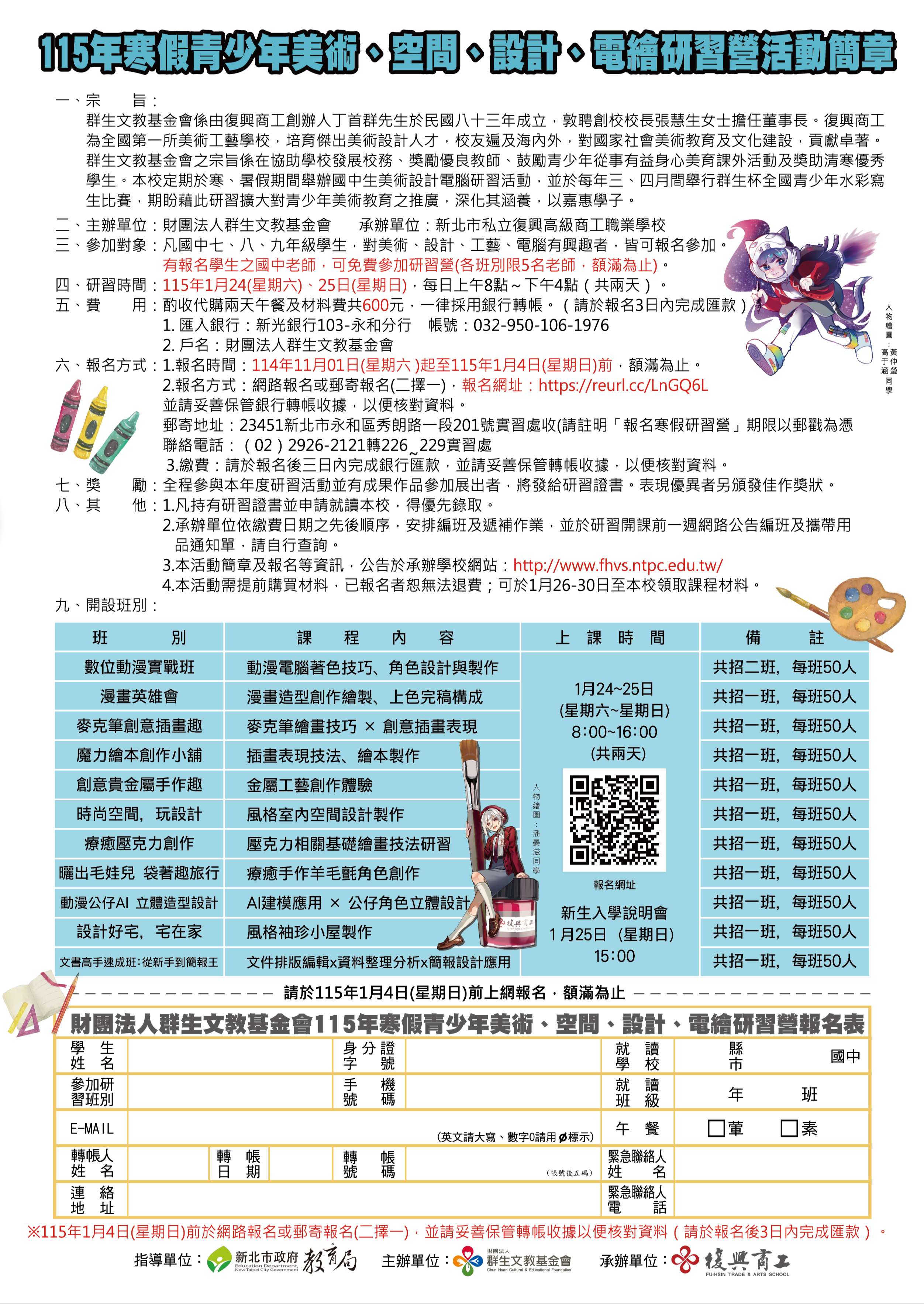 七、報名時間:114年11月01日(星期六)起至115年1月04日(星期日)前,額滿為止。任何課程相關問題,聯絡電話(02)2926-2121轉226~229。