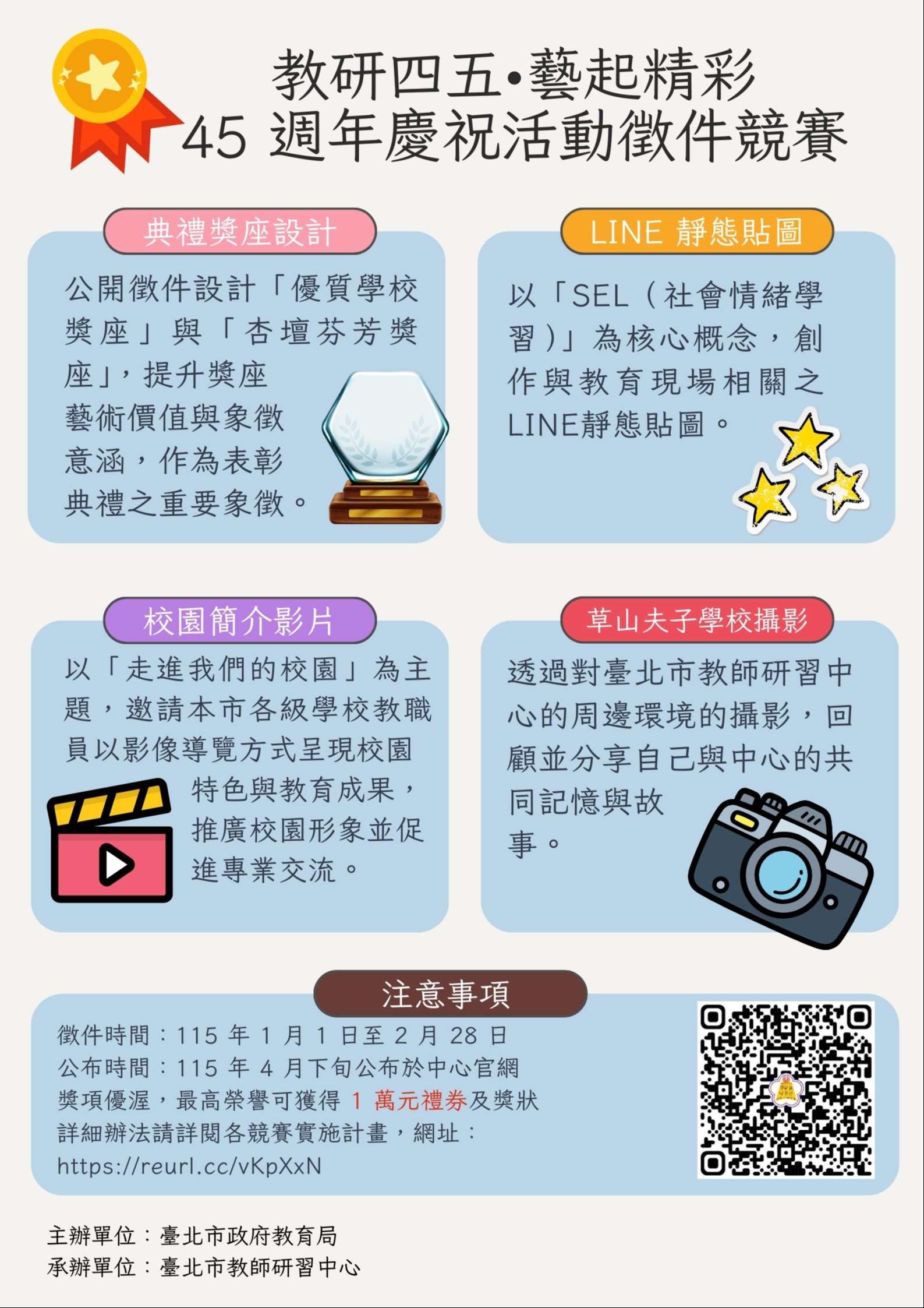 【轉知】臺北市教師研習中心辦理45週年慶競賽之實施計畫及電子海報,詳如附件。