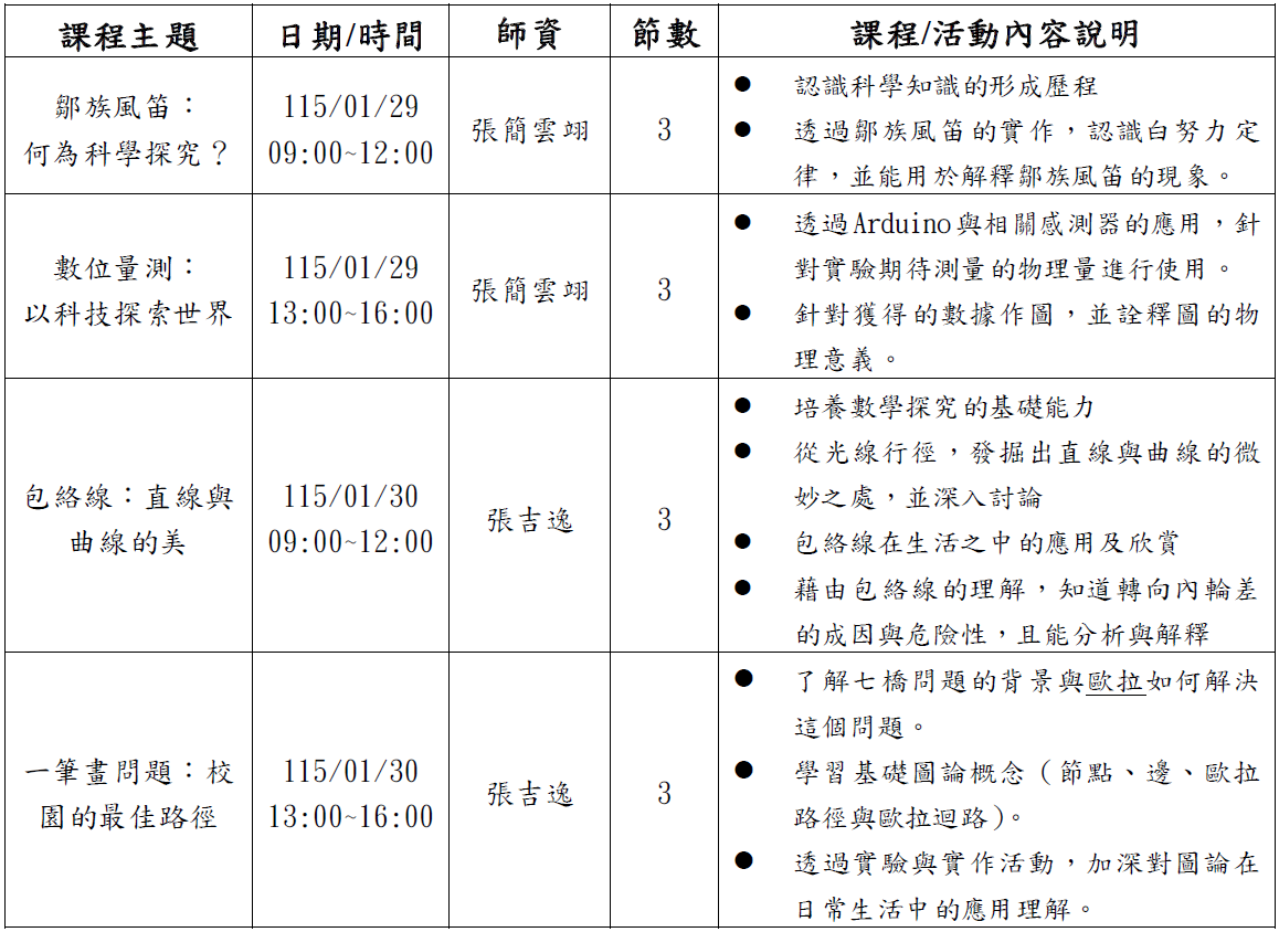 3. 請各校錄取同學於活動第一天115年1月29日(四)報到時,繳交活動費用500元予本校資優召集人張吉逸老師。