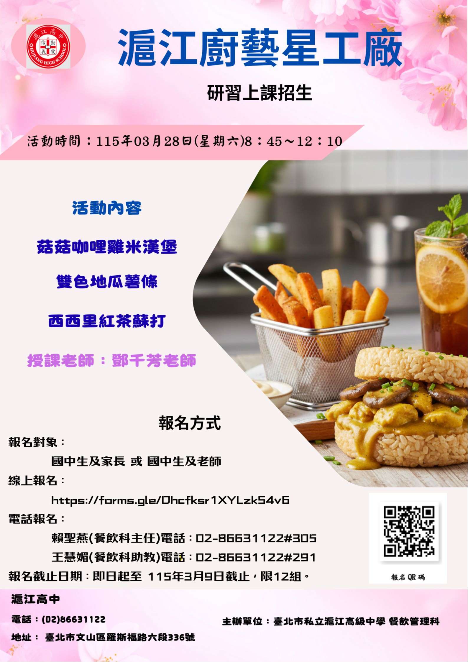 一、為協助國中學生適性發展與生涯探索,深化技職教育體驗 與實作精神,本校特於櫻花盛開之際辦理【櫻見學堂・職 人手作】教育嘉年華,展示餐飲、航電、室設三科多元學 習成果、生命教育實踐及永續環境行動。