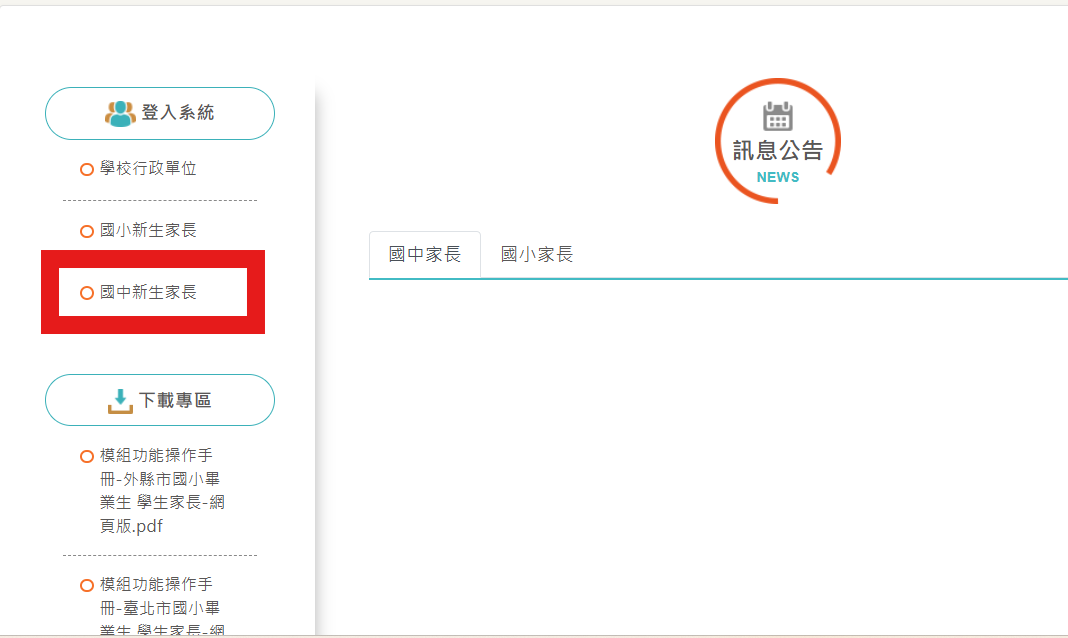 步驟1. 左側選單 / 選擇「國中新生家長」(本市家長採「單一身分驗證」方式登入)
