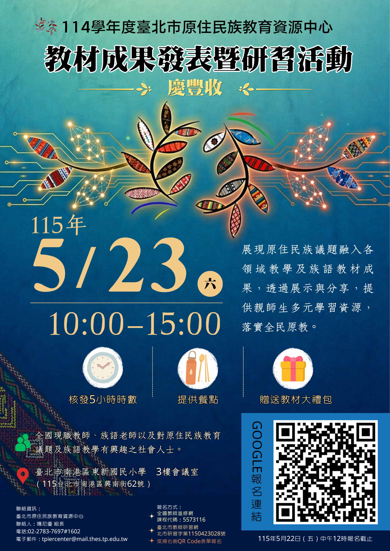 轉知-臺北市原住民族教育資源中心辦理「教材成果分享會暨推廣研習」實施計畫及宣傳海報,詳如附件。